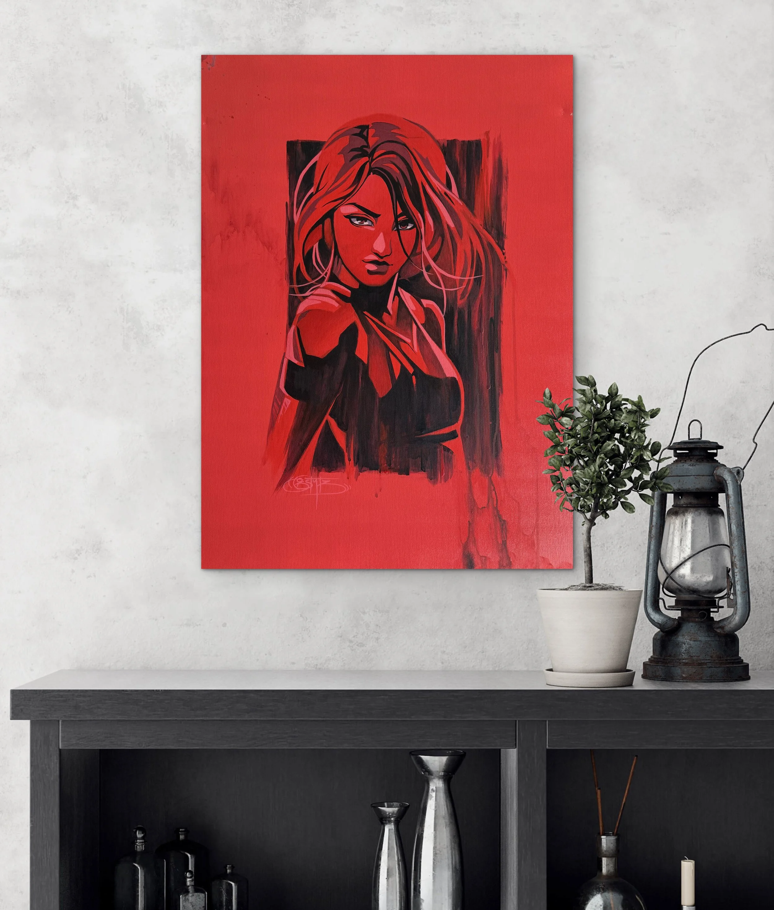 Black Widow brings the counterpoint: stillness with edge. Against a vivid red field, her presence radiates controlled intensity, discipline, and the deeply earned confidence of a survivor who stands firmly in her own truth.
