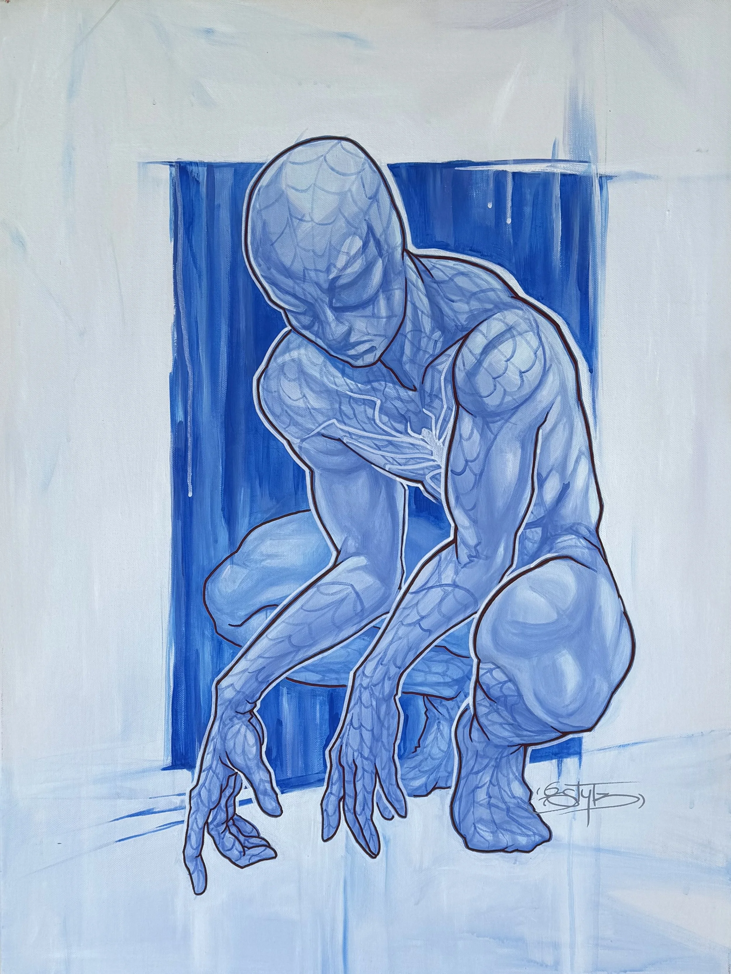 Spider-Man, caught in his dynamic “web-ready” crouch, embodies instinct, agility, and quiet responsibility — the poised balance between fear and courage in the instant before action.